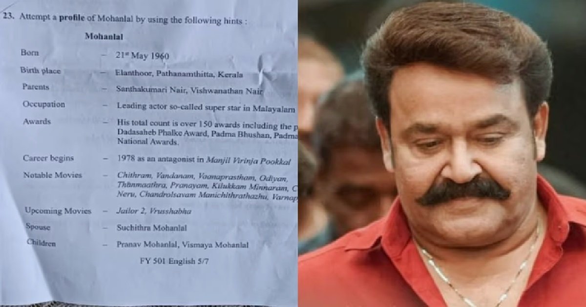 ഈ വർഷത്തെ ഹയർ സെക്കൻ്ററി ഒന്നാം വർഷ ഇംഗ്ലീഷ് മോഡല് പരീക്ഷയിൽ മോഹൻലാലിനെ കുറിച്ചൊരു ചോദ്യം വന്നിരിക്കുകയാണ്. മോഹൻലാലിന്റെ പ്രൊഫൈൽ എഴുതുക എന്നതാണ് ചോദ്യം. ഒപ്പം പത്ത് പോയിന്റുകളും കൊടുത്തിട്ടുണ്ട്. ആറ് മാർക്കിനുള്ള ചോദ്യമാണിത്. ചോദ്യപേപ്പറിന്റെ ഫോട്ടോകൾ സോഷ്യൽ മീഡിയയിൽ പ്രചരിച്ചതിന് പിന്നാലെ ആറ് മാർക്ക് പിള്ളേര് തൂക്കി എന്നാണ് ആരാധകർ കമന്റുകളായി കുറിക്കുന്നത്.