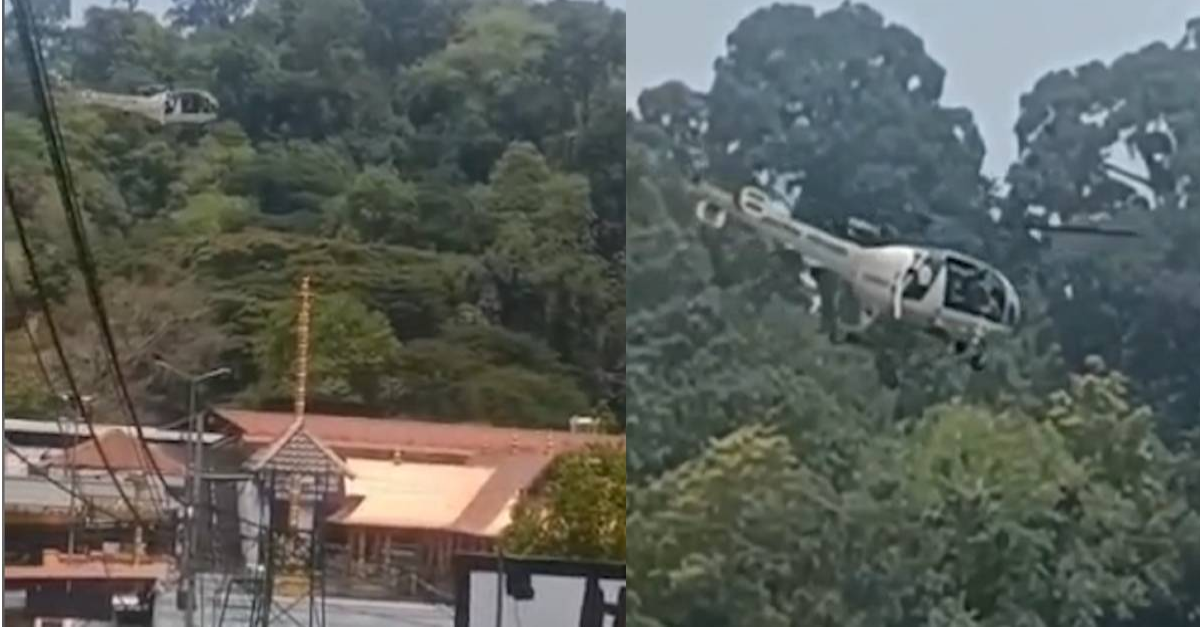 ഇന്നലെ രാവിലെ ഏകദേശം 11 മണിയോടെയാണ് തീരസുരക്ഷാ സേനയുടെ സി ജി 821 ഹെലികോപ്റ്റർ സന്നിധാനത്തിന് മുകളിൽ പറന്നത്. കൊടിമരത്തിന് ഏകദേശം അഞ്ച് മീറ്റർ ഉയരത്തിൽ വരെ ഹെലികോപ്റ്റർ എത്തിയതായി റിപ്പോർട്ടുണ്ട്. ഏകദേശം 30 സെക്കൻഡ് നേരം ഹെലികോപ്റ്റർ പ്രദേശത്ത് തുടരുകയും ചെയ്തു.