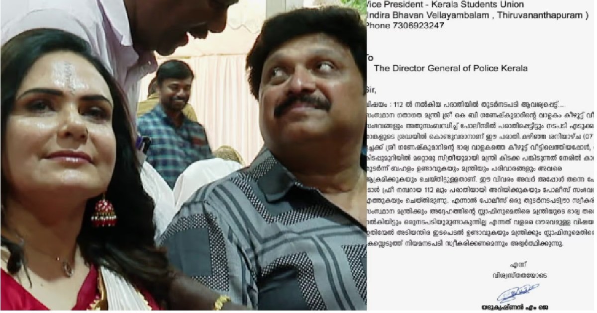 ഗണേഷ് കുമാറിനെതിരെ ഗുരുതര ആരോപണവുമായി ഭാര്യ ബിന്ദു മേനോൻ രംഗത്തെത്തിയതിന് പിന്നാലെയാണ് കെഎസ്യു പരാതിയുമായി രംഗത്തെത്തിയത്. ഗണേഷ് കുമാറിനെ വാളകത്തെ വീട്ടിൽ കാണാൻ പാടില്ലാത്ത സാഹചര്യത്തിൽ കണ്ടുവെന്നും ഇതിന്റെ തെളിവ് തന്റെ കയ്യിൽ ഉണ്ടെന്നും ഗണേഷിന്റെ ഭാര്യ ബിന്ദു ഏഷ്യാനെറ്റ് ന്യൂസിനോട് പറഞ്ഞു. ഗണേഷിന്റെ സന്തത സഹചാരികൾ തടഞ്ഞുവെച്ച് മൊബൈൽ കൈക്കലാക്കാൻ ശ്രമിച്ചുവെന്നും ബിന്ദു പറഞ്ഞു. പൊലീസിനെ വിളിച്ചതിന് പിന്നാലെ ആ സ്ത്രീയെ കാറിൽ കയറ്റി വിട്ടു. സ്ത്രീ പോയതിന് പിന്നാലെ ഗണേഷ് കുമാർ മുറിയിൽ കയറി വാതിൽ അടക്കുകയും ചെയ്തു. പൊലീസ് സംഭവ സ്ഥലത്ത് എത്തിയെങ്കിലും ഇടപെടാതെ പിൻവാങ്ങുകയായിരുന്നുവെന്നും ഗണേഷിന്റെ ഭാര്യ ബിന്ദു പറഞ്ഞു.