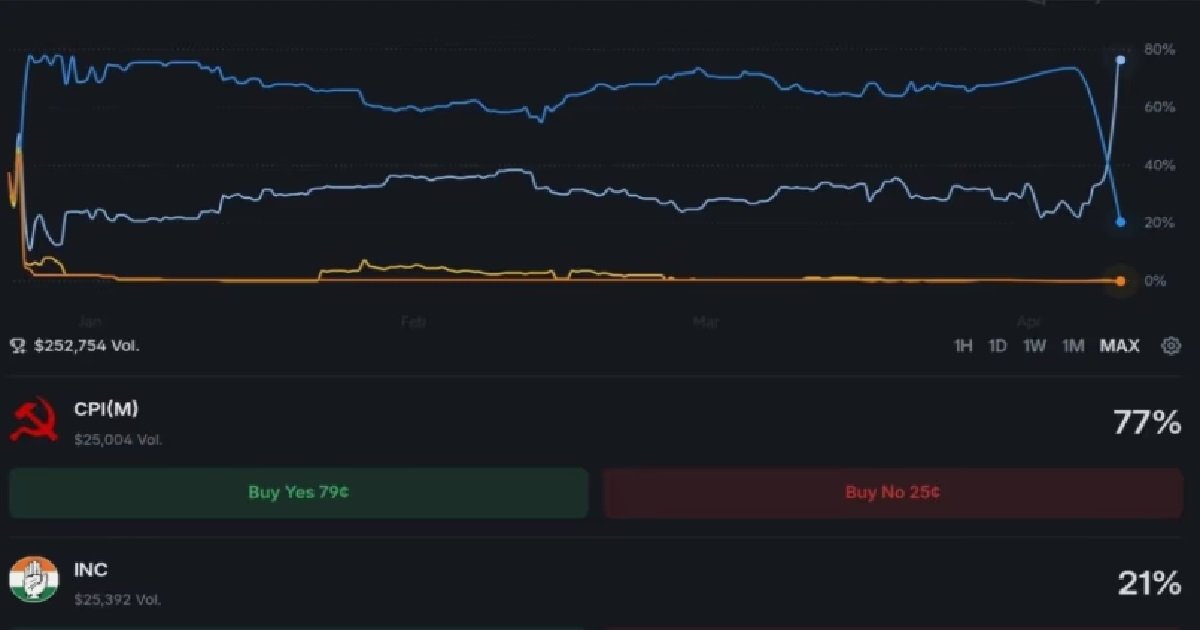 അമേരിക്കൻ പ്രസിഡന്റ് തിരഞ്ഞെടുപ്പിലടക്കം കൃത്യമായ പ്രവചനങ്ങൾ നടത്തി ലോകശ്രദ്ധ നേടിയ പ്ലാറ്റ്‌ഫോമാണ് പോളിമാർക്കറ്റ്. ക്രിപ്‌റ്റോ കറൻസിയിലൂടെ പ്രശസ്തനായ ഷെയ്ൻ കോപ്ലാൻ സ്ഥാപിച്ച ഈ സൈറ്റിൽ പ്രമുഖ അമേരിക്കൻ വ്യവസായികൾക്കും നിക്ഷേപമുണ്ട്. ഏപ്രിൽ ഒമ്പതിന് വോട്ടെടുപ്പ് പുരോഗമിക്കവെയാണ് യുഡിഎഫിന്റെ ഗ്രാഫ് താഴേക്ക് പതിക്കുകയും ഇടതുമുന്നണിയുടെ സാധ്യതകൾ വർധിക്കുകയും ചെയ്തത്. ഓൺലൈൻ ടെക്നോളജി പോർട്ടലുകൾ റിപ്പോർട്ട് ചെയ്ത ഈ ‘ട്വിസ്റ്റ്’ പ്രവാസി മലയാളികൾക്കിടയിലും രാഷ്ട്രീയ നിരീക്ഷകർക്കിടയിലും വലിയ ചർച്ചയായിട്ടുണ്ട്.