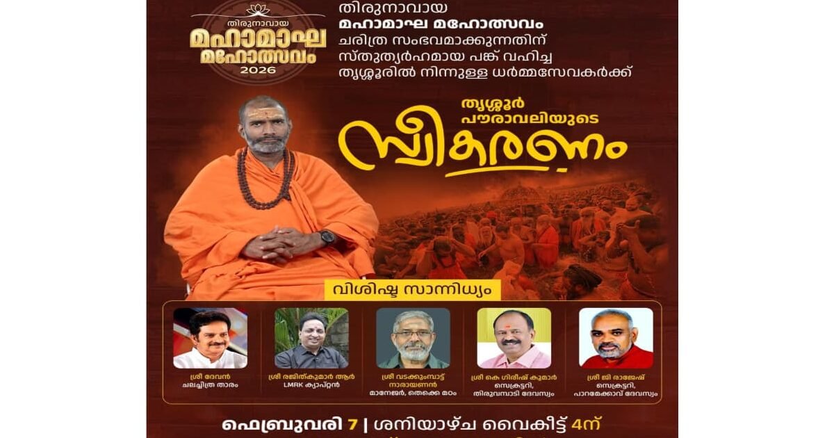 തൃശൂർ. ഇതാദ്യമായി കേരളത്തിൽ സംഘടിപ്പിച്ച കേരള കുംഭമേള തിരുന്നാവായ മഹാമാഘ മഹോൽസവത്തെ ചരിത്രത്തിൽ അടയാളപ്പെടുത്തും വിധം സംഘടിപ്പിക്കുന്നതിനായി സ്തുത്യർഹമായ പങ്ക് വഹിച്ച തൃശൂരിൽ നിന്നുള്ള ധർമ്മസേവകരെ തൃശൂർ പൗരാവലി ആദരിക്കുന്നു. ശനിയാഴ്ച വൈകീട്ട് നാലിന് തൃശൂർ പാറമേക്കാവ് അഗ്രശാലയിൽ സംഘടിപ്പിക്കുന്ന സ്വീകരണസമ്മേളനത്തിൽ മഹാമണ്ഡലേശ്വർ സ്വാമി ആനന്ദവനം ഭാരതി അനുഗ്രഹഭാഷണം നടത്തും. നടൻ ദേവൻ, എൽ എം ആർ കെ ക്യാപ്റ്റൻ രജിത് കുമാർ എന്നിവർ മുഖ്യാതിഥികളായി പങ്കെടുക്കും. തൃശൂരിന്റെ സാമൂഹ്യ-സാംസ്കാരിക-രാഷ്ട്രീയ രംഗത്തുള്ളവർ, കൊച്ചിൻ ദേവസ്വം ബോർഡ്, തിരുവമ്പാടി-പാറമേക്കാവ് ദേവസ്വം പ്രതിനിധികൾ തുടങ്ങിയവരും പങ്കെടുക്കും.