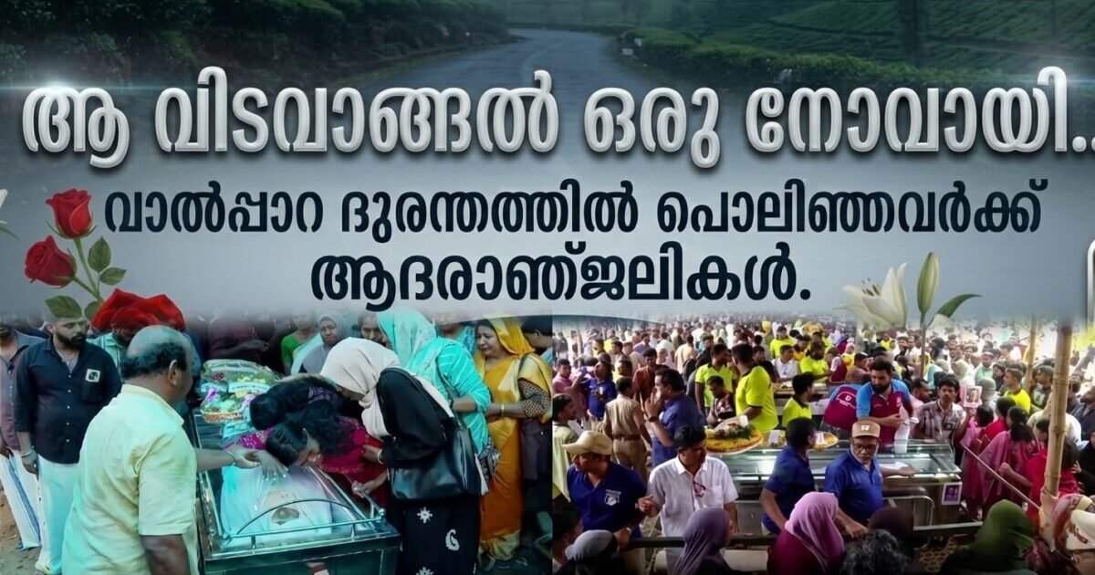 മലപ്പുറം: വാൽപ്പാറയിലുണ്ടായ വാഹനാപകടത്തിൽ പൊലിഞ്ഞ ആറ് അധ്യാപകർ ഉൾപ്പെടെ ഒൻപത് പേർക്കും നാട് തേങ്ങലോടെ വിടനൽകി. മലപ്പുറം പാങ്ങ് ഗവ. ഹയർസെക്കൻഡറി സ്കൂൾ മൈതാനത്ത് നടന്ന പൊതുദർശനത്തിൽ പ്രിയപ്പെട്ടവരെ അവസാനമായി ഒരു നോക്ക് കാണാൻ ആയിരങ്ങളാണ് ഒഴുകിയെത്തിയത്. സംസ്കാര ചടങ്ങുകൾ ഉച്ചയോടെ വിവിധയിടങ്ങളിൽ പൂർത്തിയായി. അപകടത്തിൽ മരിച്ചവർക്കായി രാഷ്ട്രപതിയും പ്രധാനമന്ത്രിയും അനുശോചനം രേഖപ്പെടുത്തി.